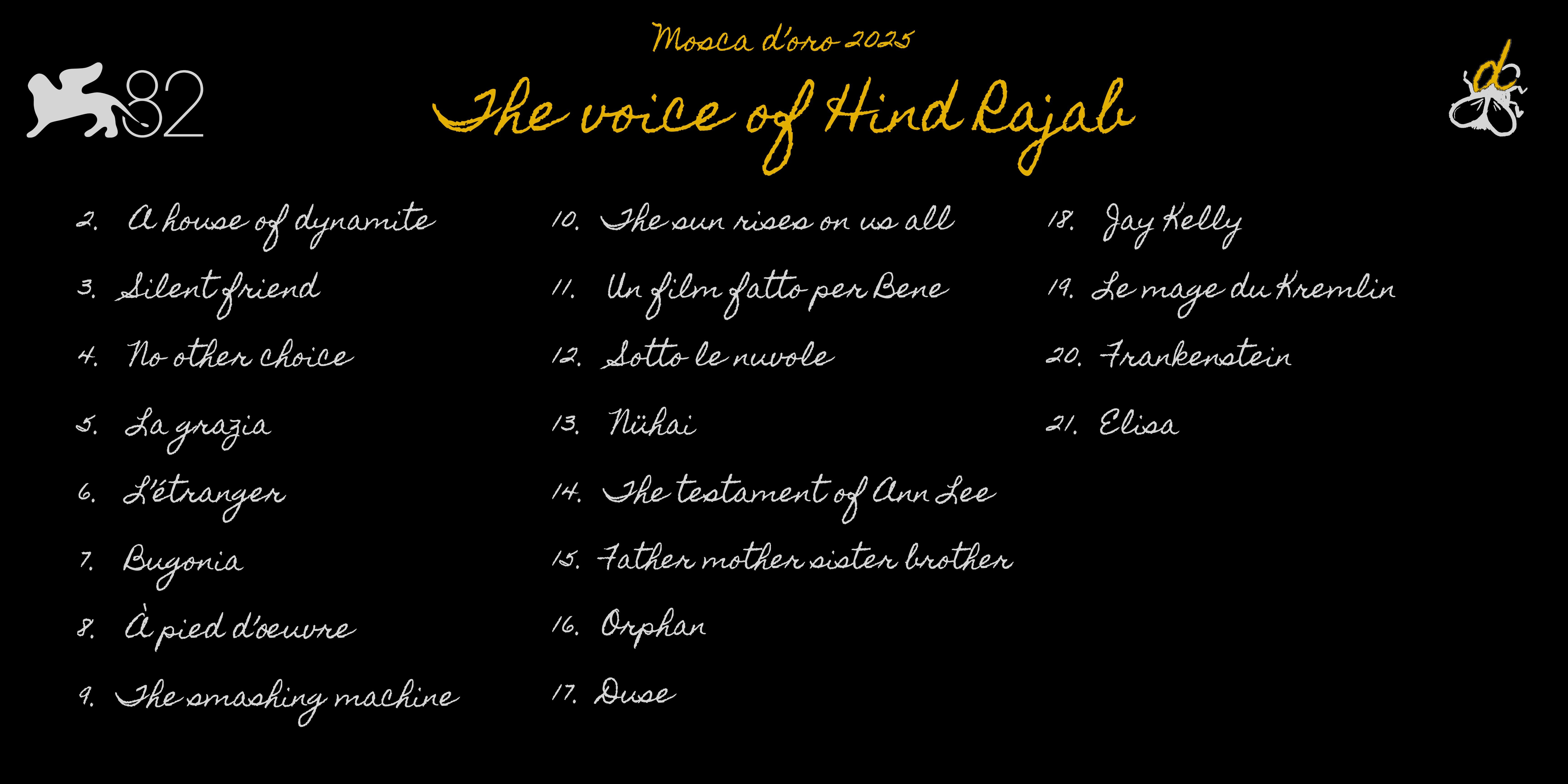 Fa male dire che forse La voce di Hind Rajab ha perso la sua prima battaglia, quella che alcune settimane fa lo vedeva in concorso a Venezia e vicinissimo al Leone d’oro. Lo sappiamo, non è andata così, chi ha seguito la Mosca del Cinema sa anche che il film di Kaouther Ben Hania a mio modesto parere meritava molto di più del Gran Premio con cui è tornato a casa, tanto che lo avevo messo in cima alla classificona finale del concorso.